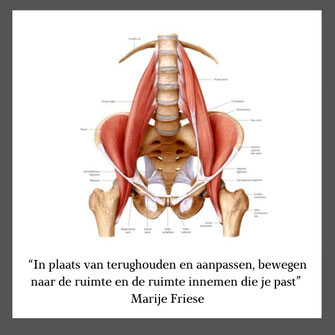 De psoas is een plek (net als de buik, de onderrug, de schouders, de nek) om stress en emoties vast te houden. Dit kan ervaren worden als strakte: het ontberen van souplesse in het lijf of rigiditeit t.o.v. het leven. De psoas scant op veiligheid, het zet aan tot vechten, vluchten, bevriezen én het helpt je te centreren, weer in balans te komen. Het geeft je je authenticiteit in beweging of hoe jij je beweegt door het leven. Hoe meer je bent verbonden mét en aanwezig kunt zijn ín je buik, inclusief je psoas, hoe meer je kunt landen in jezelf en kunt gronden. In plaats van terughouden en aanpassen, bewegen naar de ruimte en de ruimte innemen die je past. Emoties overspoelen je niet meer. Je kunt ze dragen in je bekken. Niet vasthouden maar wel een tijdje mee zijn, waarna, als je ze gevoeld hebt, je ze weer kan loslaten.
